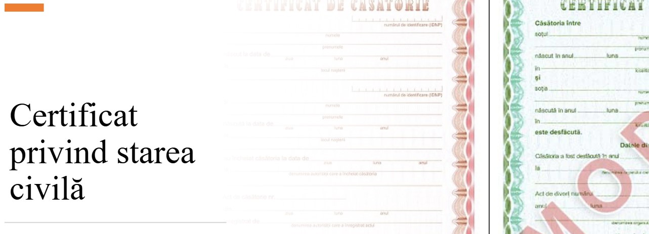 - documentele care fac dovada stării civile (certificat de căsătorie, certificat de divorţ, certificat de deces);